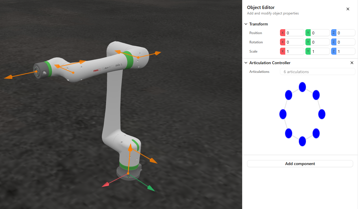 The articulation controller drives an articulation tree, letting you move the joints in a kinematic chain.
