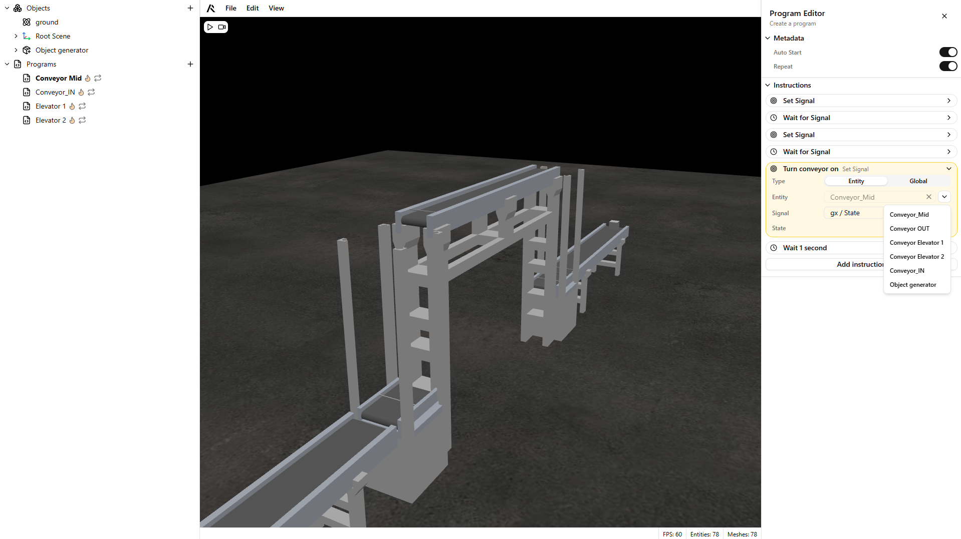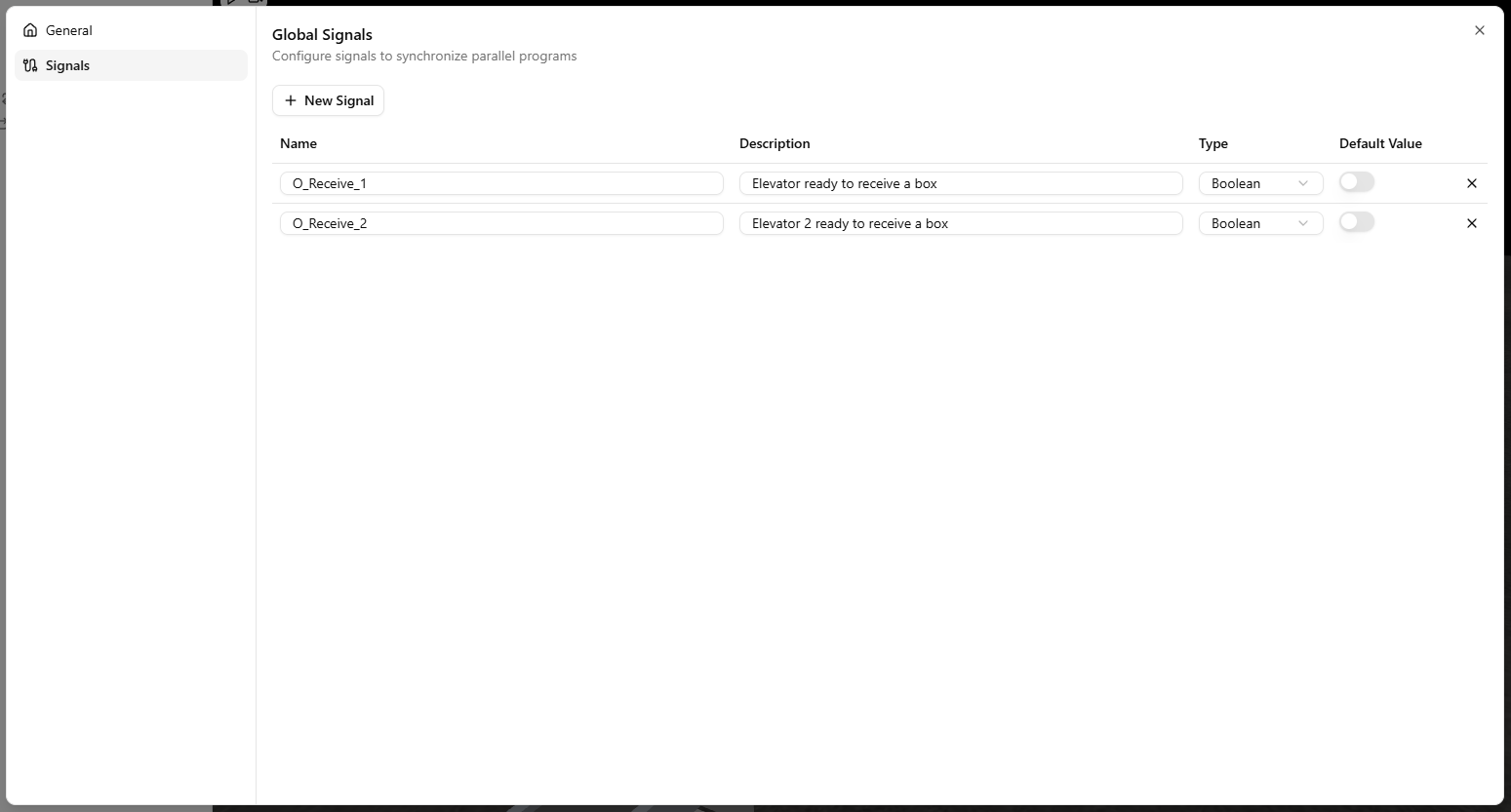 Global signals let you coordinate behaviors across the scene. They are configured in the application's Settings.