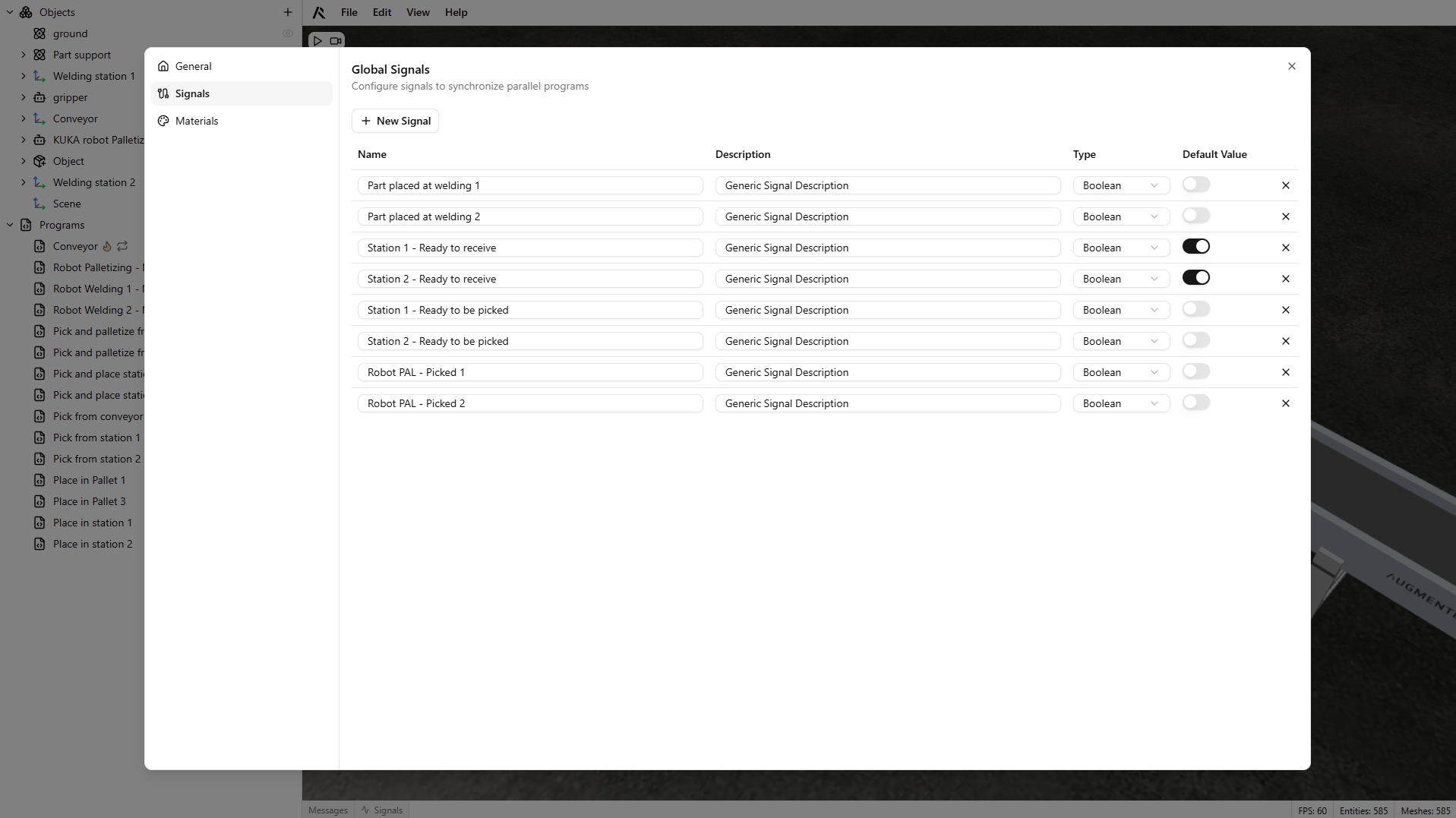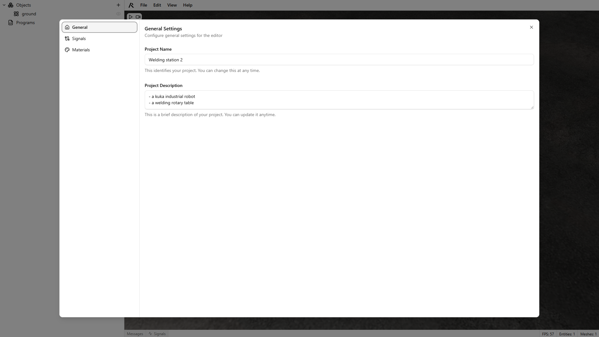 Configure project metadata, signals, and materials