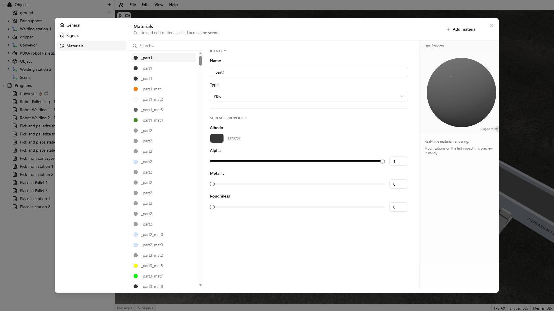 Click New material to create a material. Then set its name and properties based on the selected type (PBR or Standard).
